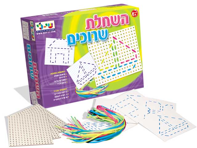| תכולה | 6 לוחות מחוררים, 9 דגמים להעתקה ו- 40 שרוכים צבעוניים. |