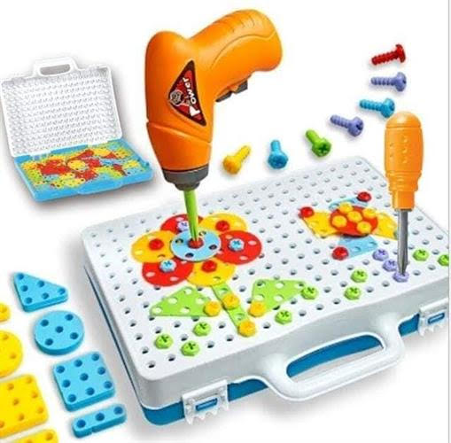 המשחק כולל משטח הברגה, ברגים מפלסטיק קשיח, מברגה חשמלית ודגמים.