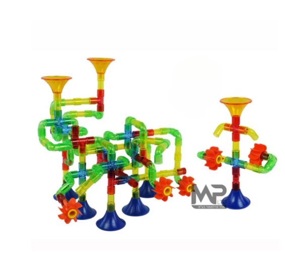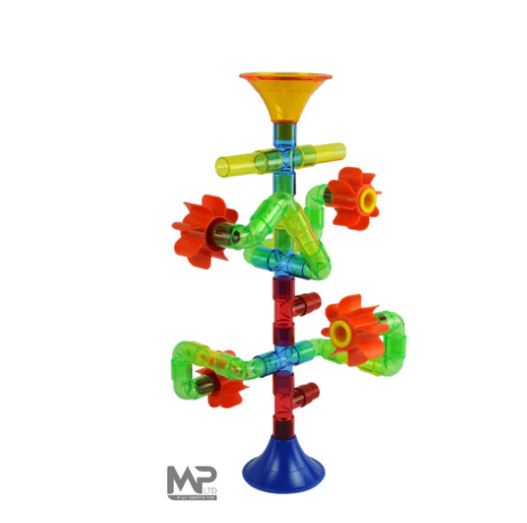 סוגי הבנייה מורכבים מצינורות, משפכים וגלגלי מים. כאשר מחברים את צורות הבניין הללו יחד, נוצר נתיב מים. שופכים מים למשפך וצפו במים זורמים בצינורות ומסובים את גלגלי המים. החלקים עשויים מחומר פלסטי בטוח וניתן לכביסה וקלים לשימוש