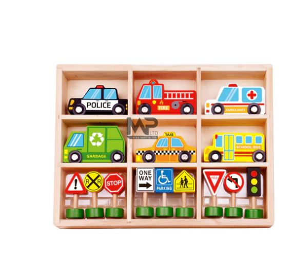 מארז הכולל 6 מכוניות עץ שונות ו-9 תמרורים עץ
