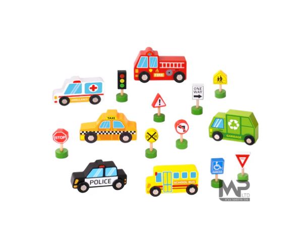 סט מכוניות עץ + תמרורים