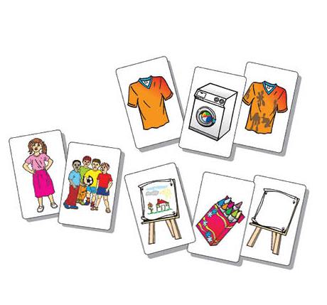 על השחקן ליצור רצף של 3 קלפים לפי סדר ההתרחשות, להניח לידם קלף דמות או דמויות ולנסח את המשפט הלשוני המתאים.
