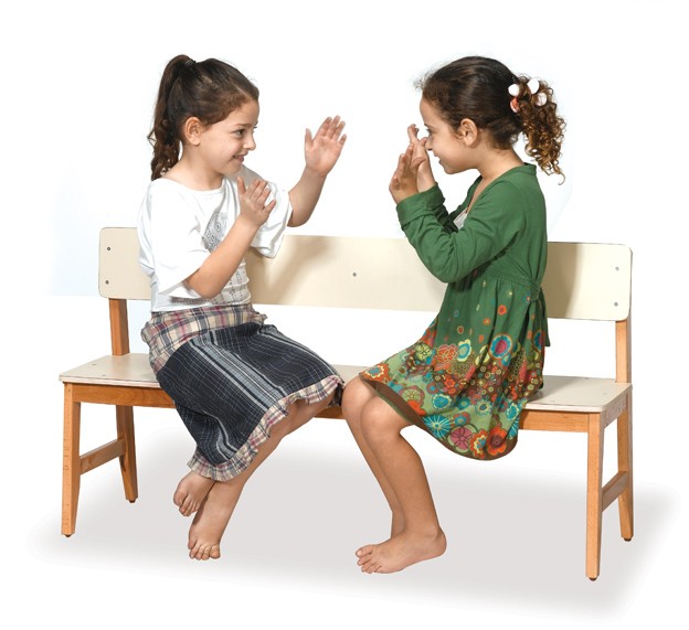 ספסל גן לגני ילדים עם רגל ומשענת מעץ.