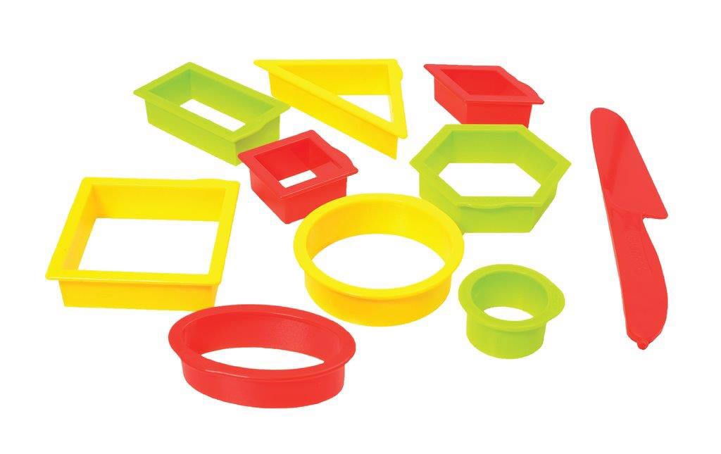 ערכה ליצירת צורות – Smart Shapes 9 צורות שונות בגדלים שונים וסכין לחיתוך בבצק קינטי ו/או חול קינטי המהווים השלמה להנאה יצירה ודימיון למשחק בחול ובצק קינטי.