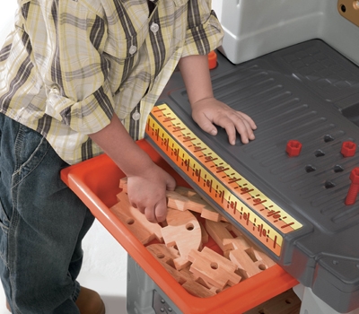 מגיע עם חלקים דמוי עץ העשויים מEVA המאפשרים לילדים לבנות 4 דגמים של מוצרים. וגם לבנות כיד הדימיון ארון אחסון שנראה כמו מגירות איכסון ,צנצנות לאחסון הברגים והאומים. וכן יש מברגה עם ביטים ומנורה שעובדים על ידי סוללות להחלפה. המוצר מגיע עם 50 יח' של אביזרים שונים כמו: 8 ברגים,8 אומים, פטיש, מברג, פלייר, מסור,17 חלקים דמוי עץ, פינים, וכן מלחציים קפיציים מפלסטיק.