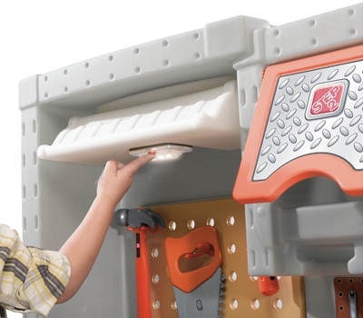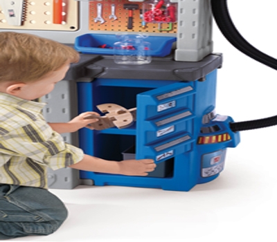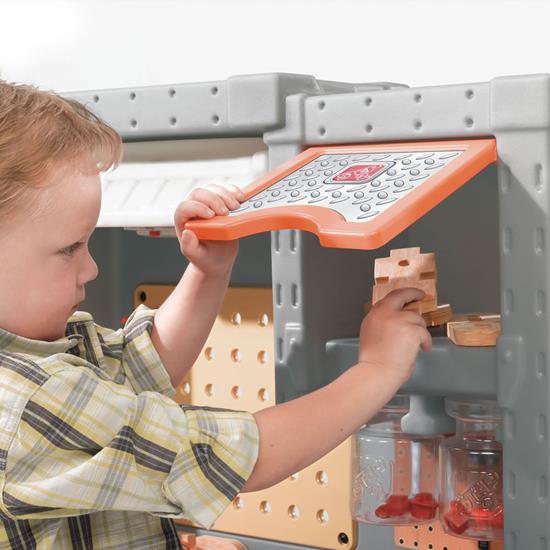 פינת מלאכה איכותית מפוארת ומאובזרת לילדים הפינת מלאכה מכילה משטח עבודה גדול עם חורים להברגה, וחורים למסמרים ומקום איכסון לברגים.