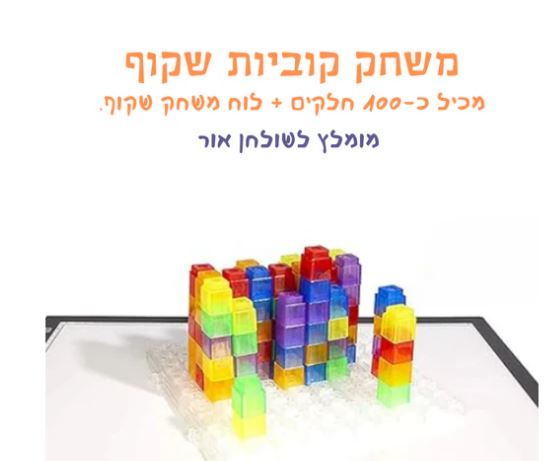 משחק הרכבה שקוף-צבעוני הכלל כ-100 חלקי קוביות בצבעים שונים + לוח שקוף מותאם